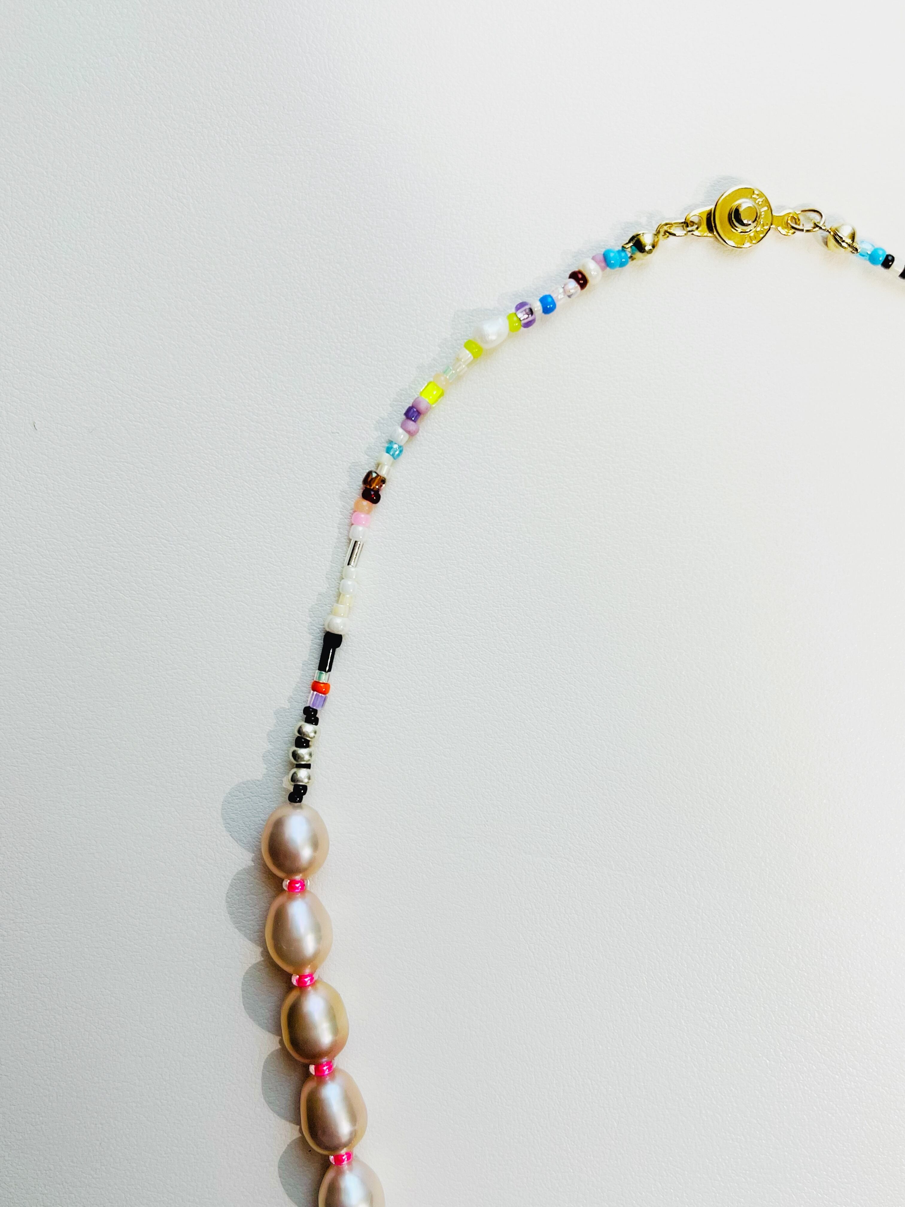 ネオンカラーのピンクビーズを天然カラーのピンクなパールの間に入れることで、お互いの色を引き立て合っています。