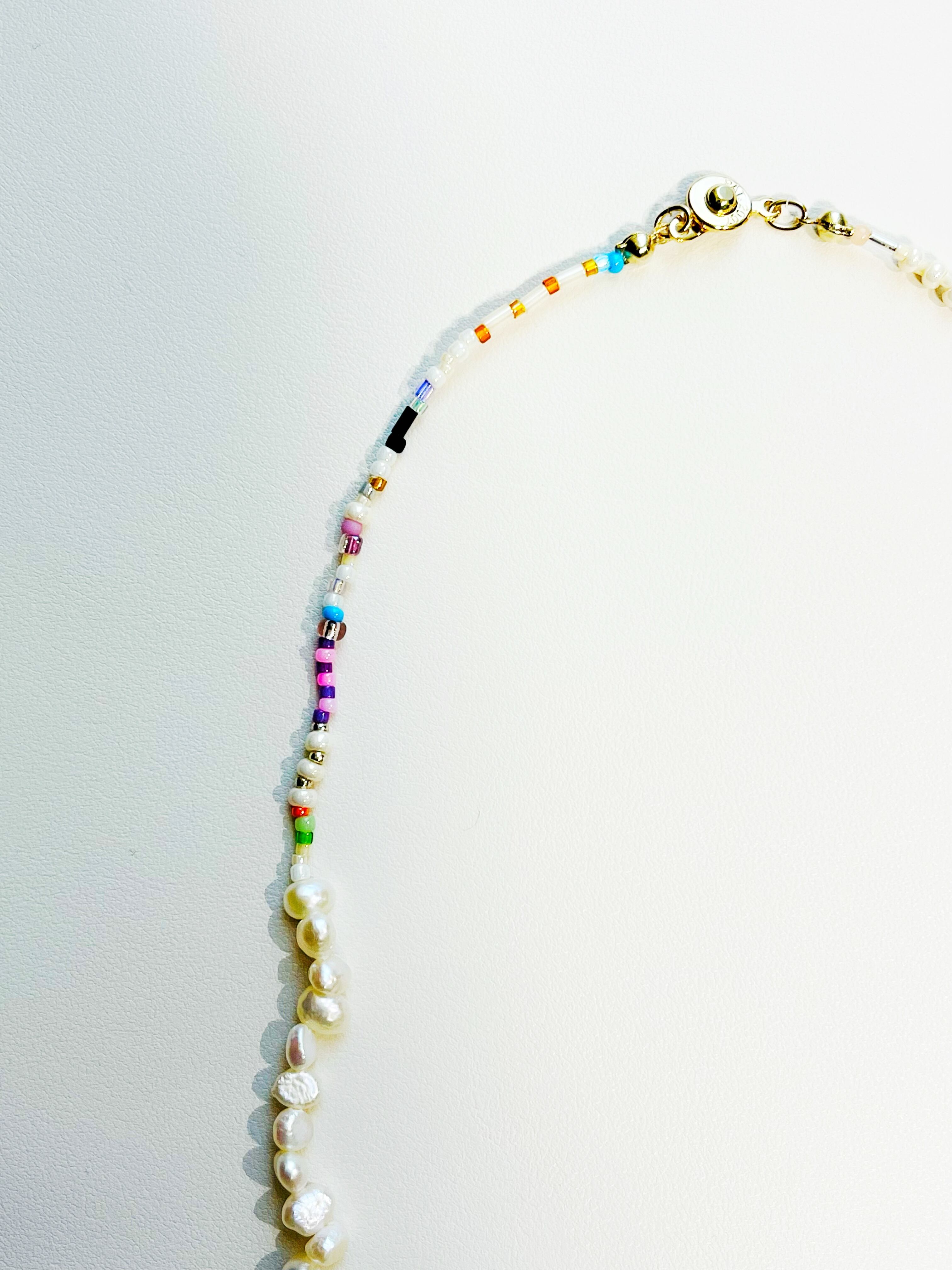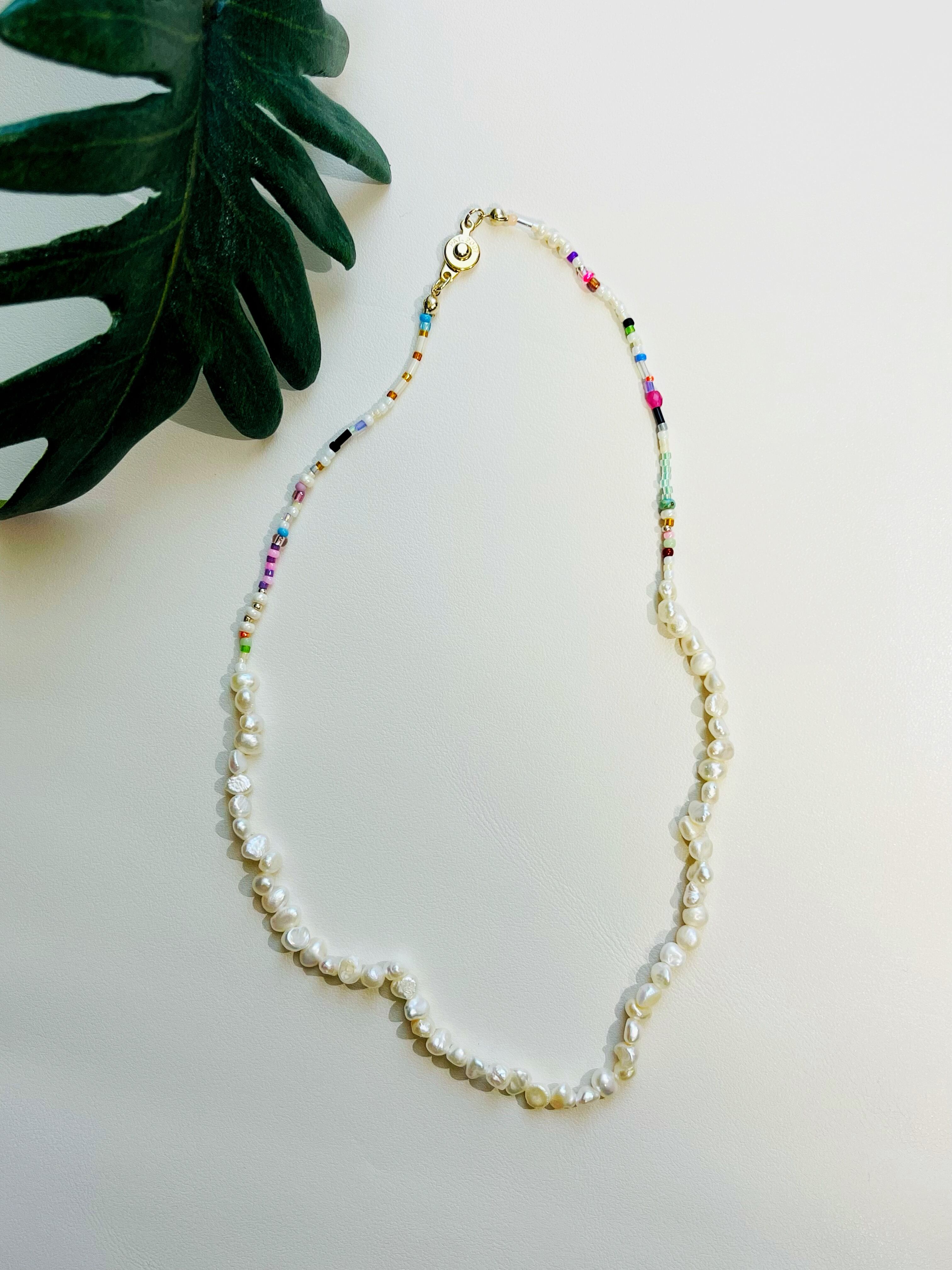 大きさや形、質感の違うビーズをつなぎ、色合いにこだわったネックレス。