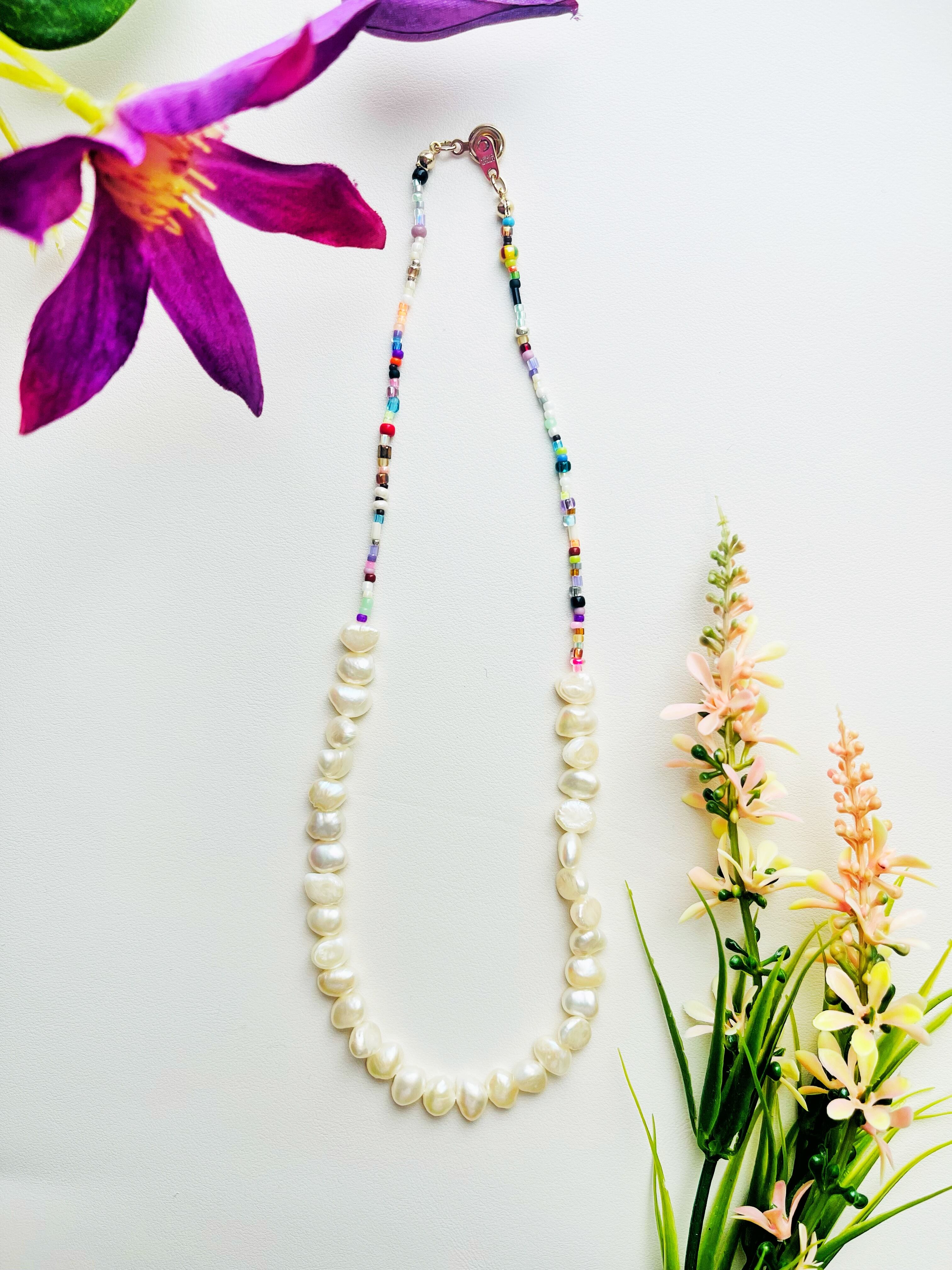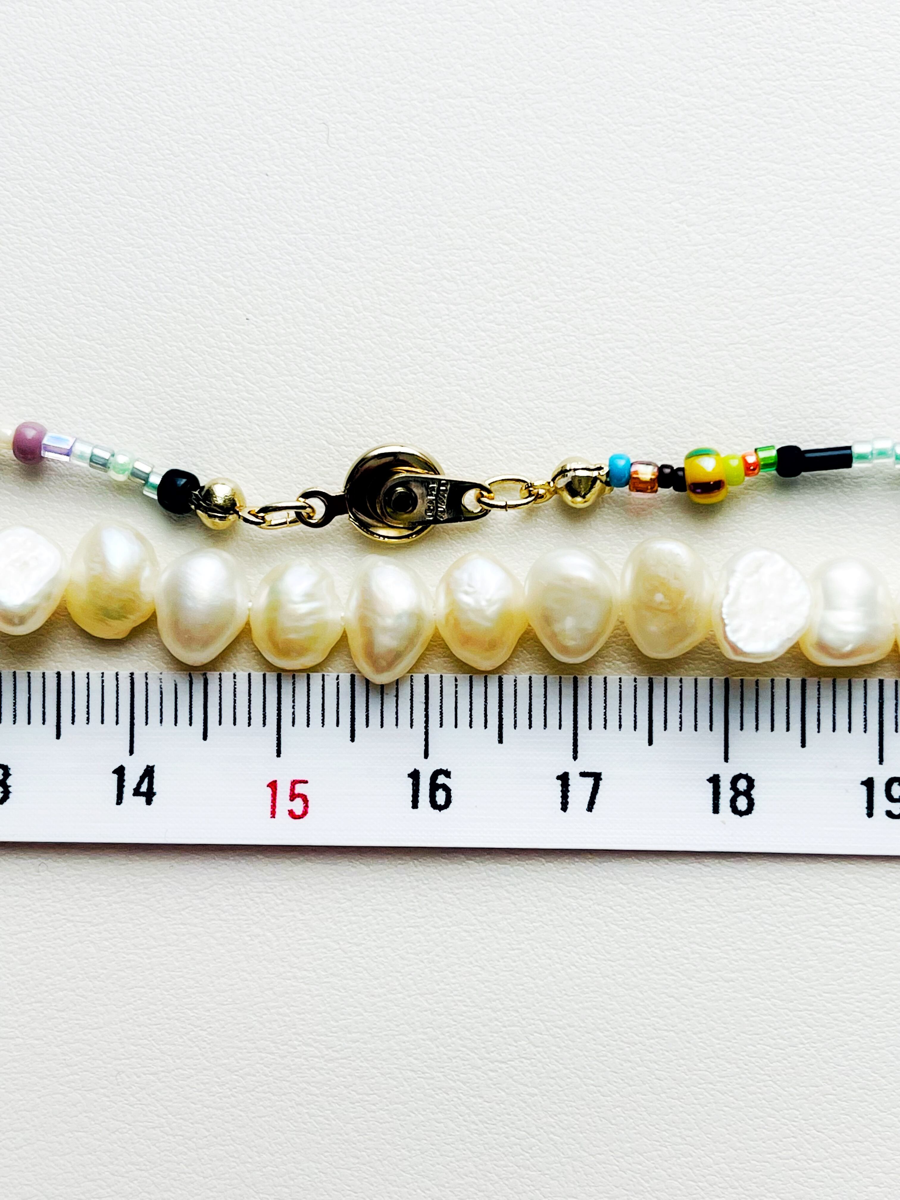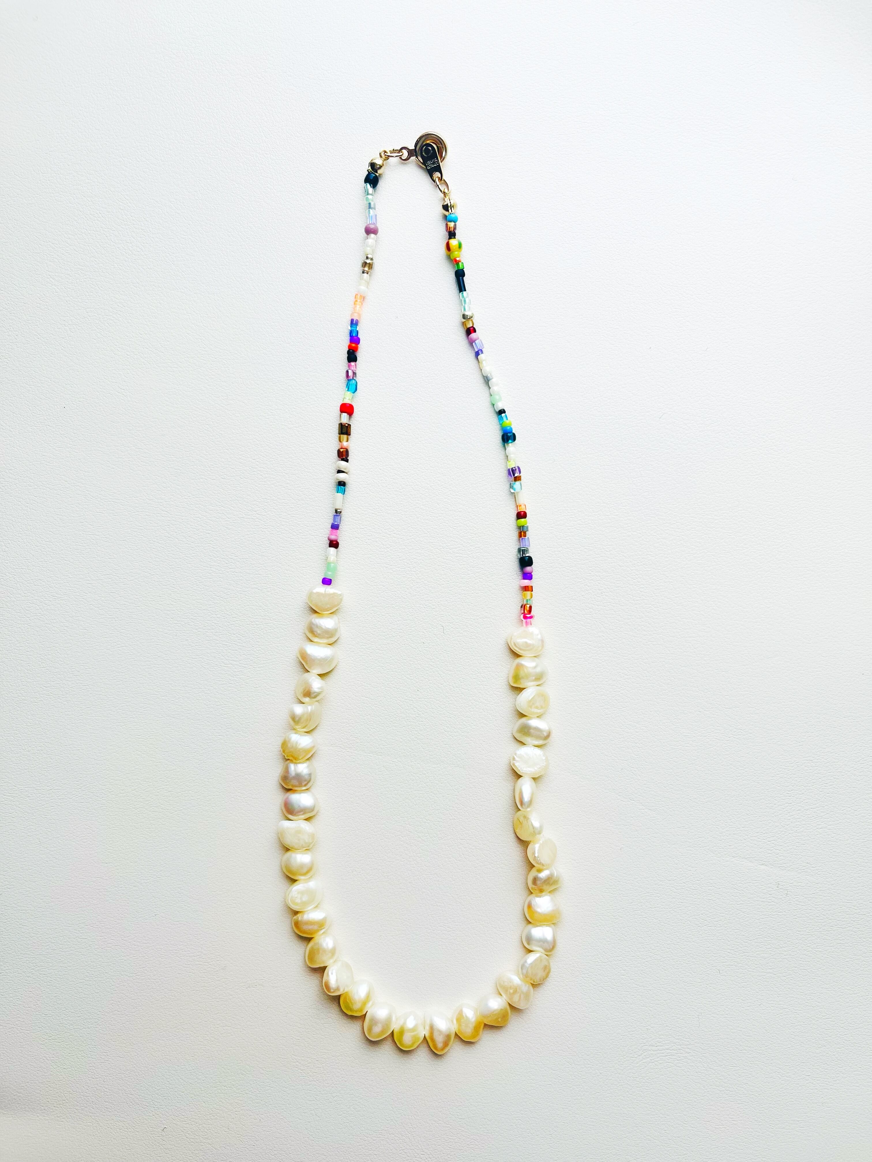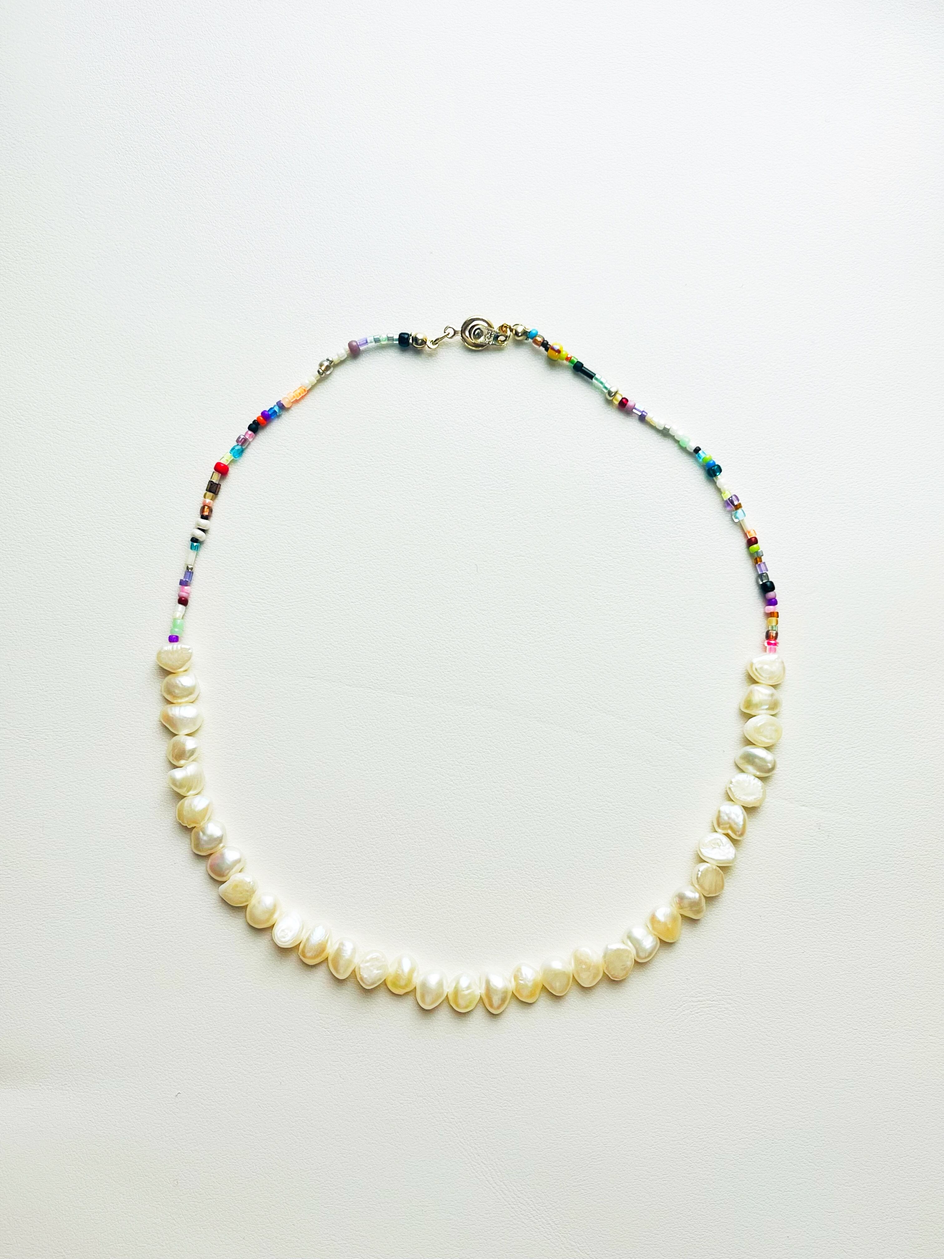 大きさや形、質感の違うビーズをつなぎ、色合いにこだわったネックレス。